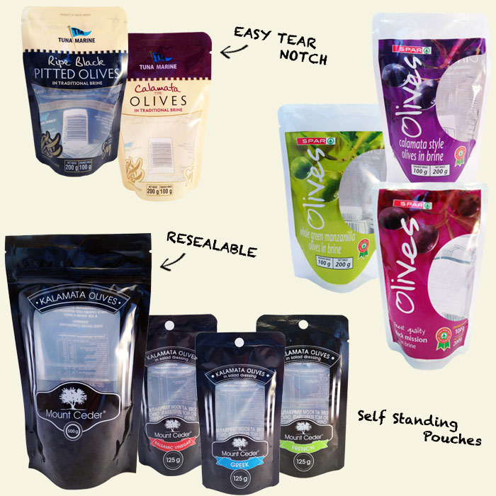 - Pickles and preserves often have a liquid portion and a solid portion. The self-standing ability of our pouch allows the pouch to be opened and kept upright preventing spillage of the contents.